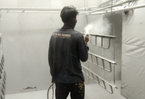 Pengecatan kering, pelapisan dengan suatu film. Dalam bentuk film bubuk digunakan dalam lapisan tipis workpiece kemudian dilarutkan dalam bentuk film dan dipanaskan untuk polimerisasi dan mengawetkan coating. Powder dilekatkan pada permukaan profil aluminium/Besi dengan menggunakan alat electric spray gun.